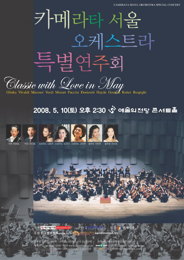 <TD class=gray><SPAN class=program><IMG height=11 src="http://www.sac.or.kr/image/2_bu_1.gif" width=11>공연 기간 :</SPAN> 2008 / 5 / 10 (토) - 2008 / 5 / 10 (토)<BR><SPAN class=program><IMG height=11 src="http://www.sac.or.kr/image/2_bu_1.gif" width=11>시 간 : </SPAN>오후2시30분<BR><SPAN class=program><IMG height=11 src="http://www.sac.or.kr/image/2_bu_1.gif" width=11><A name=Program>프로그램 :</SPAN><BR><IMG style="BORDER-LEFT-COLOR: #cecece; BORDER-BOTTOM-COLOR: #cecece; BORDER-TOP-STYLE: solid; BORDER-TOP-COLOR: #cecece; BORDER-RIGHT-STYLE: solid; BORDER-LEFT-STYLE: solid; BORDER-RIGHT-COLOR: #cecece; BORDER-BOTTOM-STYLE: solid" hspace=10 src="http://www.sac.or.kr/web/db1/new/image/101/prog_12691_1.jpg" align=right border=1> M. Glinka_Overture "Rouslan and Ludmila" <BR>A. Vivaldi_Sposa son disprezzata <BR>- Opera "BAJAZET" 中 소프라노 김동주 <BR>J. Massnet_Pleurez! pleurez, mes yeux! <BR>- Opera "Le Cid" 中 <BR>G. Verdi_Ernani, Ernani, involami <BR>- Opera "Ernani" 中 <BR><BR>W.A. Mozart_Concerto in G Major, KV. 313 플루트 석지연 <BR><BR>G. Puccini_O mio vabbino caro <BR>- Opera "Gianni Schicchi" 中 소프라노 노안나 <BR>Quando m'en vo' - Opera "LA BOHE'ME" 中 <BR>G. Donizetti_Il dolce suono mi colpi di sua voce! <BR>- Opera "Lucia di Lammermoor" 中 <BR><BR>F. Haydn_Vada adagio, Signorina <BR>- Opera "La Quakera spiritosa" 中 소프라노 고미현 <BR>C. Gounod_Je veux vivre - Opera "Romeo et Juliette" 中 <BR>C. Gounod_O Dieu !...Air des bijoux" - Opera "Faust" 中 <BR><BR>J. Rutter_Suite Antique 플루트 오신정 <BR><BR>O. Respighi_Poema sinfonico "Pini di Roma" <BR><BR><SPAN class=program><IMG height=11 src="http://www.sac.or.kr/image/2_bu_1.gif" width=11>출 연 :</SPAN><BR>* 지휘 : 최영철 (한국첼로학회장, 사단법인 카메라타 서울 예술감독 겸 상임지휘자) <BR>* 협연 : 소프라노 고미현, 김동주, 노안나 <BR>플루트 석지연, 오신정 (인제대 교수) <BR><SPAN class=program><IMG height=11 src="http://www.sac.or.kr/image/2_bu_1.gif" width=11>가 격 :</SPAN> R석 50,000원 S석 30,000원 A석 10,000원 <BR><SPAN class=program><IMG height=11 src="http://www.sac.or.kr/image/2_bu_1.gif" width=11>회원할인 :</SPAN> 골드/블루회원 10% <BR><SPAN class=program><IMG height=11 src="http://www.sac.or.kr/image/2_bu_1.gif" width=11>장 소 :</SPAN> 콘서트홀 <BR><SPAN class=program><IMG height=11 src="http://www.sac.or.kr/image/2_bu_1.gif" width=11>장 르 :</SPAN> 음악회 <BR><SPAN class=program><IMG height=11 src="http://www.sac.or.kr/image/2_bu_1.gif" width=11>주 최 :</SPAN> 예인예술기획 <BR><SPAN class=program><IMG height=11 src="http://www.sac.or.kr/image/2_bu_1.gif" width=11>전화 번호 :</SPAN> 02-586-0945 <BR><SPAN class=program><IMG height=11 src="http://www.sac.or.kr/image/2_bu_1.gif" width=11>주관/협찬/후원 :</SPAN> 주관: 음악교육신문/ 협찬: 은파악기/ 후원: (사)카메라타 서울(camerataseoul.org), 한국첼로학회(cello.kr) <BR><SPAN class=program><IMG height=11 src="http://www.sac.or.kr/image/2_bu_1.gif" width=11>기 타 :</SPAN> <FONT color=red>취학전 어린이의 입장은 불가합니다.(단, 일부 어린이 공연은 제외) /<BR> 공연이 시작된 이후에는 어텐던트의 유도에 따라서만 입장할 수 있습니다.</FONT><BR><BR><SPAN class=program><A href="http://www.sac.or.kr/program/ticket_info.jsp" target=_blank><IMG src="http://www.sac.or.kr/image/2_bt_tinfo.gif" border=0></A> <A href="http://www.sac.or.kr/program/ticket_info_space.jsp" target=_blank><IMG src="http://www.sac.or.kr/image/2_bt_info.gif" border=0></A></SPAN> <A onmouseup="window.open('sac_mem2.html','','left=0,top=0,status=yes,scrollbars=yes,resizable=yes,width=565,height=700')" class=snews href="http://www.sac.or.kr/program/view.jsp?prog_id=12691#"><IMG height=19 src="http://www.sac.or.kr/image/2_bt_member.gif" width=82 border=0></A><BR></TD></TR></TBODY></TABLE></TD></TR></TBODY></TABLE><A name=English>