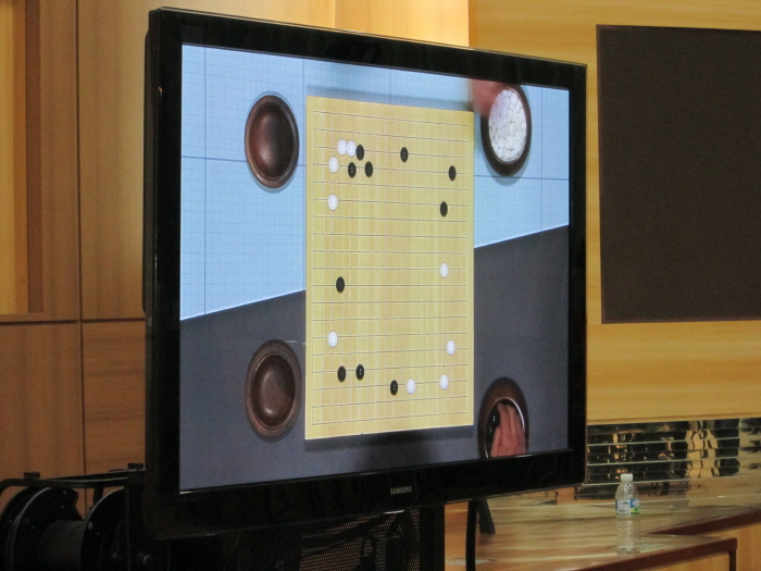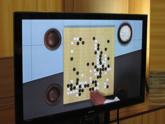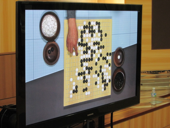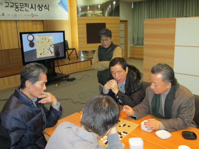 모니터를 보며 그대로 바둑돌을 놓으며 검토 중인 선수들