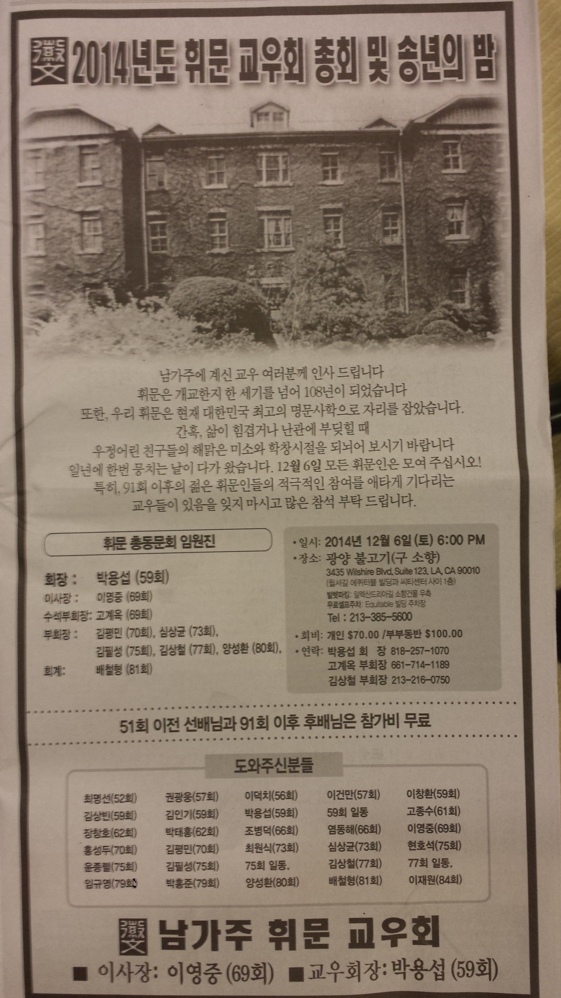 남가주 휘문교우 여러분, 일년에 한번 다함께 뭉치는 날이 다가 왔읍니다. 2014년도 남가주 휘문 교우회총회 및 송년의 밤 입니다. 그리웠던 교우들과 즐겁고 희망찬 만남의 시간을 가져보자 합니다. 각기수 노래및 장기 자랑이 있으며 푸짐한선물도 준비되어 있읍니다. 많은 참석 부탁드립니다. 날 자 : 2014년 12월 6일 (토요일) 시 간 : 오후 6시 장 소 : 작년과 동일한장소. 광양불고기(구 소향) 식당 3435 Wilshire Blvd. Los Angeles, California 남가주 휘문교우회 임원 드림 박용섭 회장 (59회) 고계옥 부회장 (69회) 김평민 부회장 (70회) 김상철 부회장 (77회) |