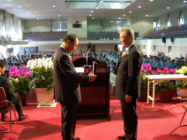 신흥우 교우회장은 김 선규 교장선생님께 송공패 전달과 송공사로 따뜻한 위로와 격려의
