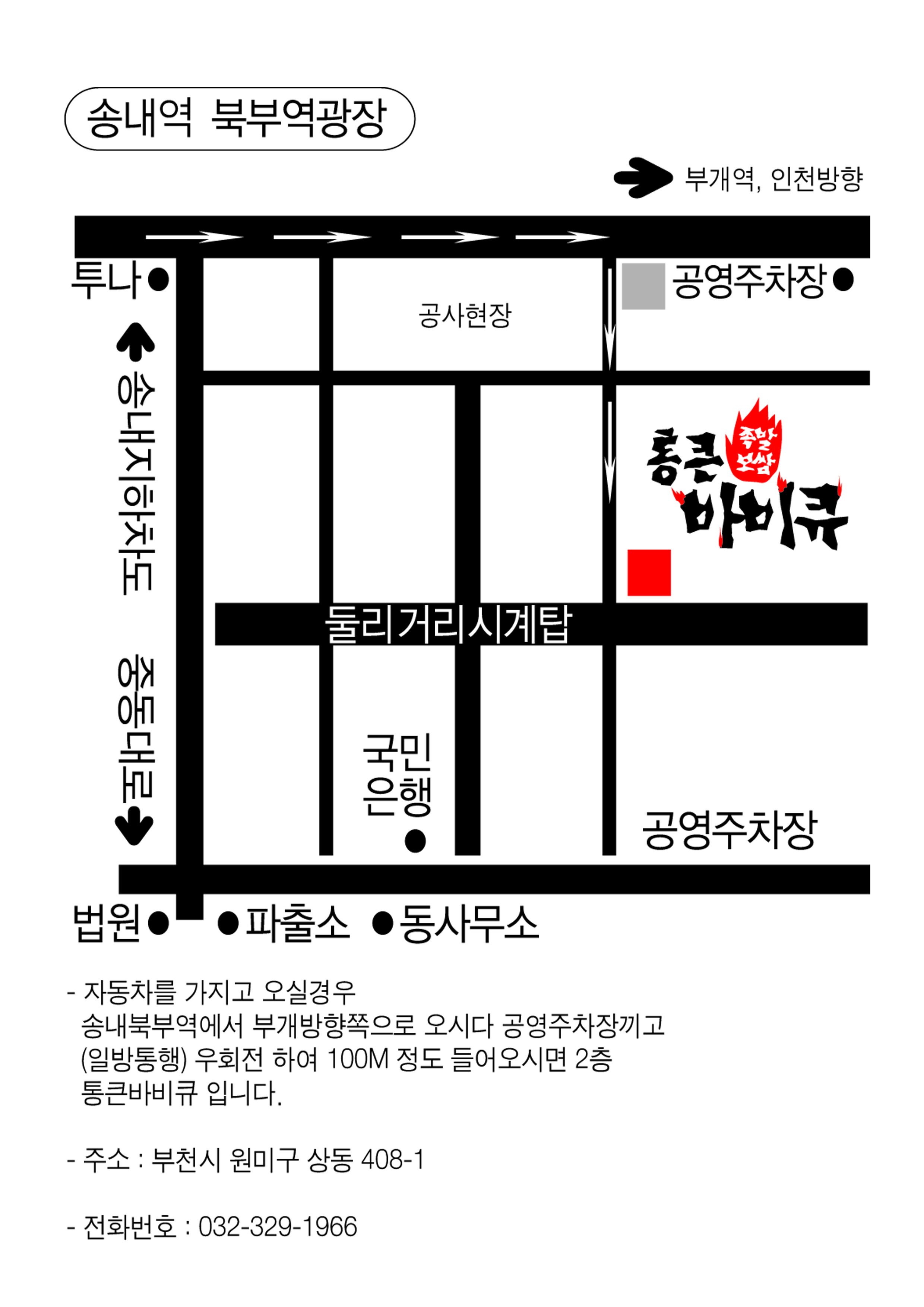 송내 북부역하차 로데오거리중앙 시계탑 에서 왼쪽으로 보면 통큰바비큐 보입니다.