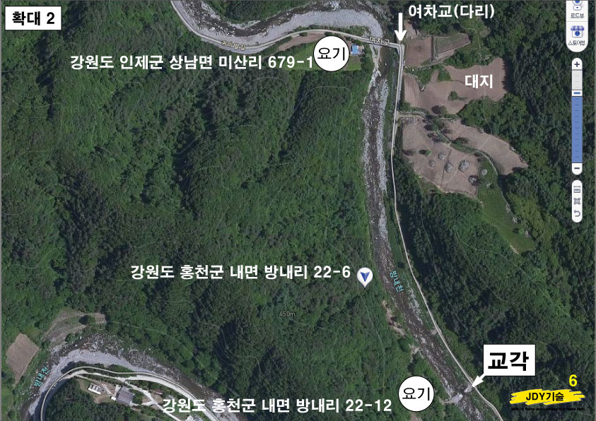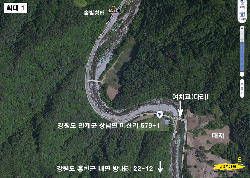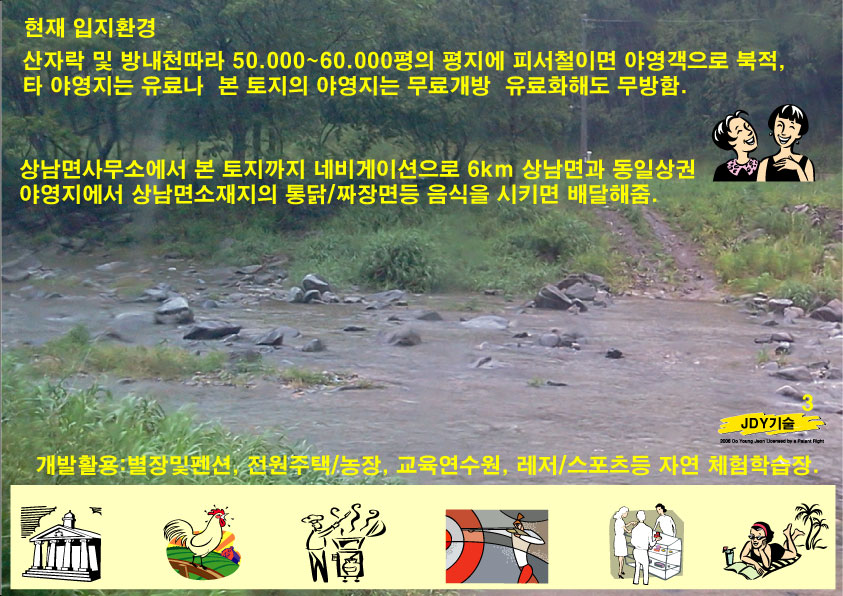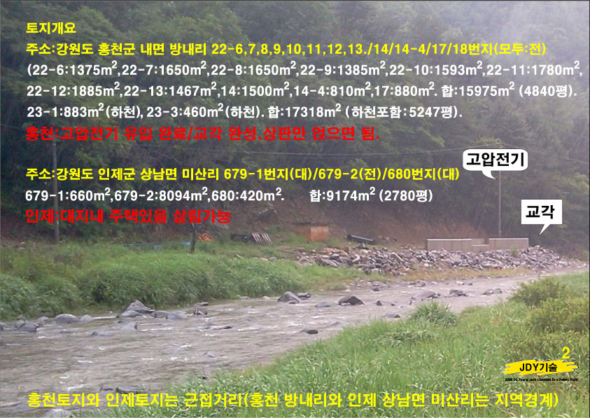 상기 홍천군 토지는 내린천과 연결되는 방내천에 접해있는 토지로 천폭이 50m 인곳에 다리를 5억 6천만원에 사비를 들여 건설중에 있고, 본 토지에 고압전기가 시설 되어있다. | ||||||