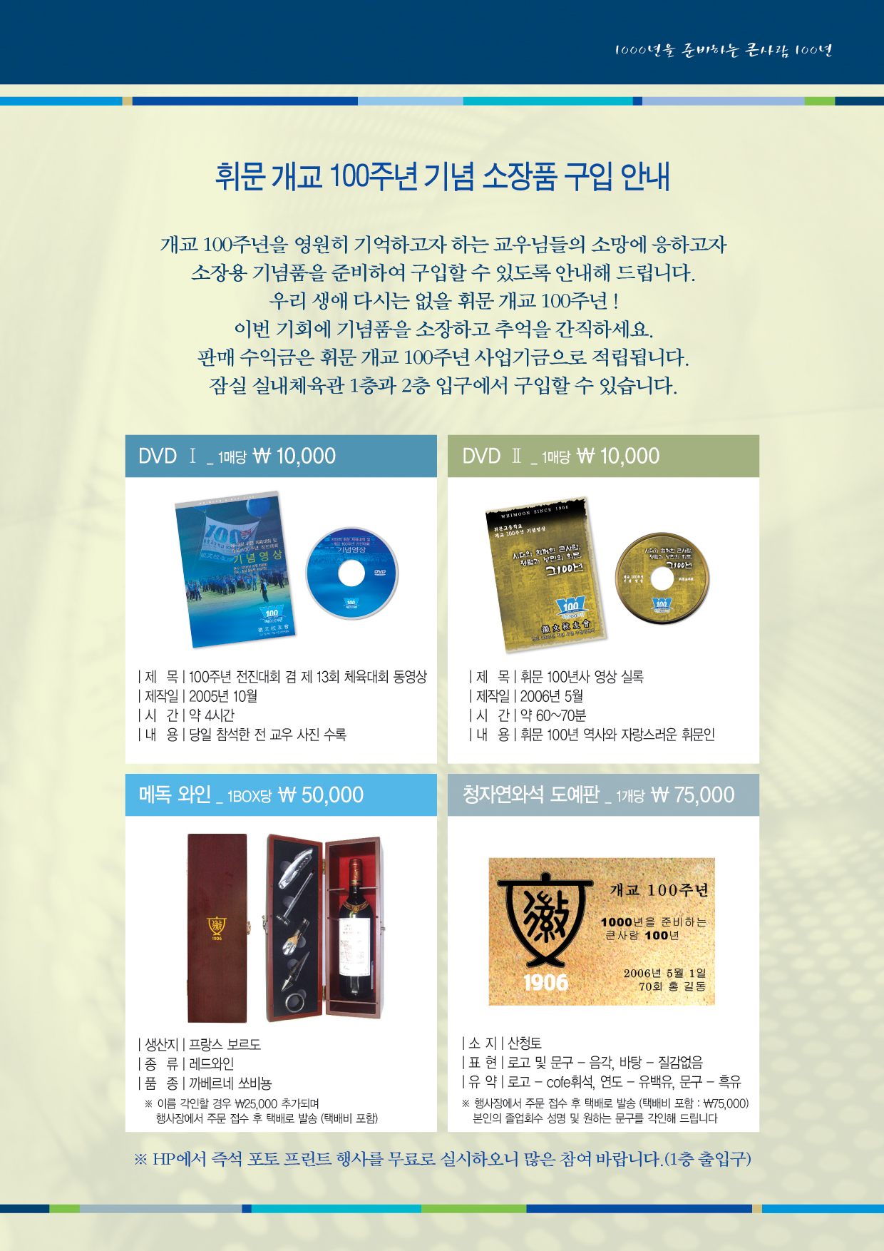 우리 생애 다시는 없을 휘문 개교 100주년!<BR>이번 기회에 기념품을 소장하고 추억을 간직하세요. <BR>판매 수익금은 개교 100주년 사업기금으로 적립됩니다. 휘문인 큰잔치 행사 당일(5월 9일) 잠실 실내체육관 <BR>1층과 2층 입구에서 아래와 같은 기념 소장품을 판매할 예정입니다.<BR><BR>1. DVD 1 : 개교 100주년 전진대회 겸 제 13회 체육대회 동영상 <BR>2. DVD 2 : 휘문 100년사 영상 실록<BR>3. 고급 와인 <BR>4. 청자연와석 도예판<BR><BR>* 기념 소장품 문의 : DVD 1,DVD2 - 73회 유동화 (010-4737-0589) <BR> 고급 와인, 청자연와석 도예판- 73회 이명렬(017-353-2010)<BR>* 기타 자세한 내용은 첨부 화일을 참조하시기 바랍니다. 감사합니다.<BR><BR> 휘문 개교 100주년 큰잔치 사업단 홍보팀 74회 노양섭 배상'>