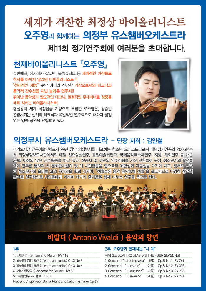제가 단장 및 지휘자로 활동하고 있는 "의정부시 유스챔버오케스트라"의 제11회 정기연주를 안내 드립니다