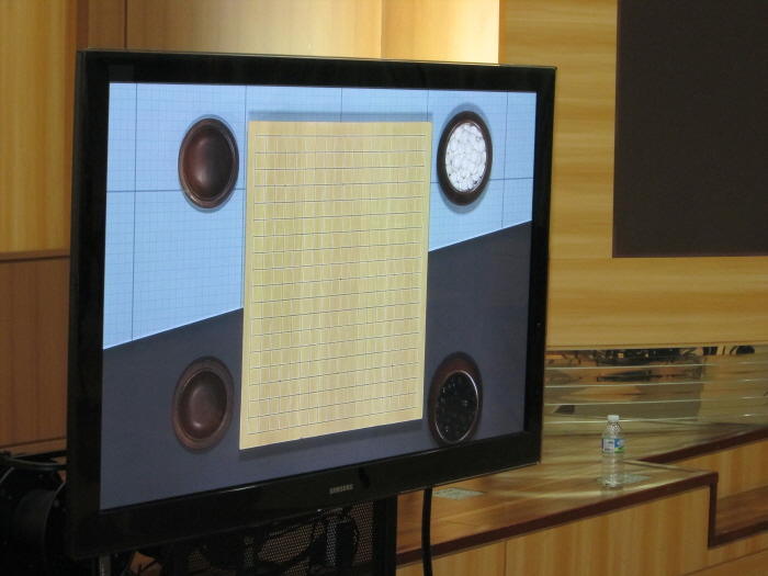 모니터를 보며 그대로 바둑돌을 놓으며 검토 중인 선수들