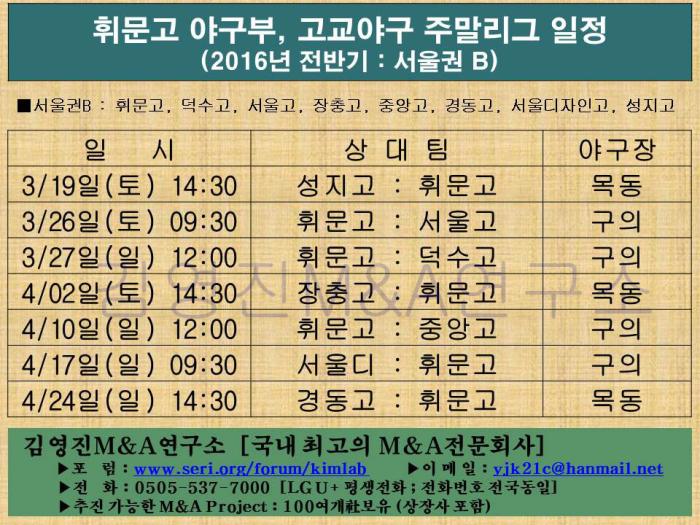 - [3259] 김영진 휘문고 야구부, 2016년 고교야구 주말리그 일정표(전반기) 2016-02-28