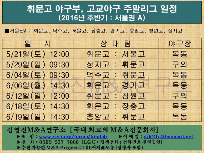- [3266] 김영진 휘문고 야구부, 2016년 고교야구 주말리그 일정표(후반기) 2016-05-04