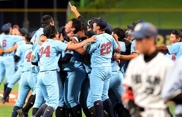 13회 연장 혈투끝에 우승을 확정짓고 운동장으로 뛰쳐나가는 휘문고 선수들