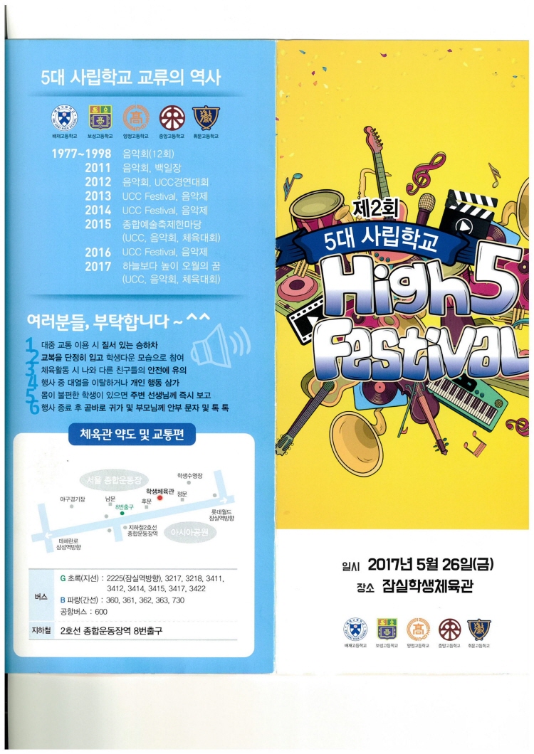 2년 전, 5대 사립학교 High 5 Festival이라는 타이틀로 5대 사립학교 재학생 1,2학년 전원이 참가하는 대규모 축제를 개최한 바 있습니다.
