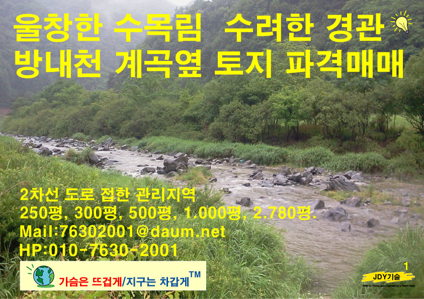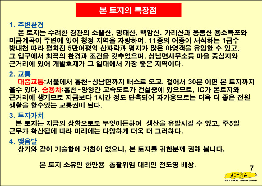 상기 홍천군 토지는 내린천과 연결되는 방내천에 접해있는 토지로 천폭이 50m 인곳에 다리를 5억 6천만원에 사비를 들여 건설중에 있고, 본 토지에 고압전기가 시설 되어있다. | ||||||