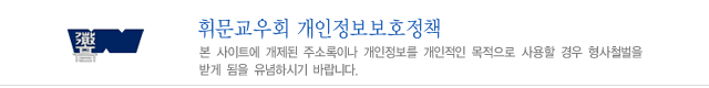 | 교우회는 적법하고 공정한 절차에 의해 최초의 회원가입 시 최소한의 필수 개인정보만을 온라인상에서 입력 받고 있습니다. 회원가입 시 입력 받는 필수 개인정보는 이름, 주민등록번호, 전화번호, 이동전화번호, 주소, 이메일 등이 있습니다. 또한 교우회에서의 설문조사 및 이벤트 시 집단 통계분석, 경품발송 및 본인 확인을 위해서는 개인정보를 요청할 수 있습니다. 이 때 입력하신 개인정보는 해당서비스 제공이나 이용자에게 밝힌 목적 이 외의 다른 어떠한 목적으로도 사용되지 않습니다. |